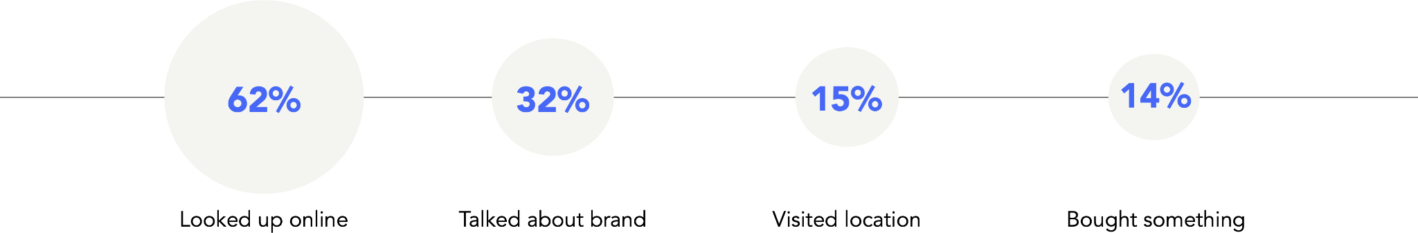 After seeing a digital billboard, 62% had looked up the brand online, 32% had talked about it, 15% had visited a location, and 14% had bought something. Exposure is frequent too, with 92.5% passing a digital billboard weekly or more often. Among those who often notice billboards, 74% have searched for a brand online afterwards, versus 48% among those who do not.