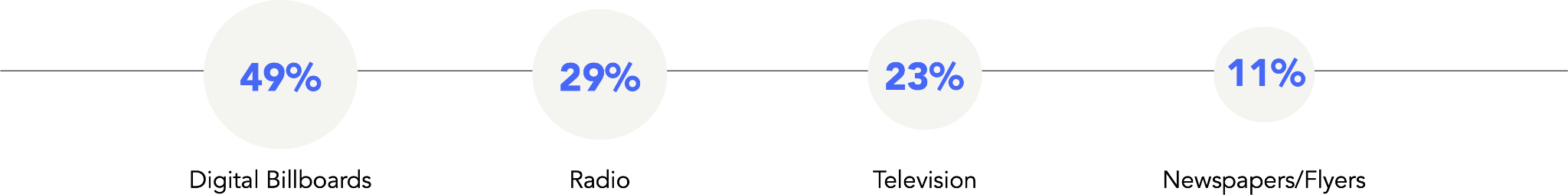When asked which channels most influence brand and purchase choices, digital billboards ranked first among offline media at 49%, ahead of radio (29%), television (23%), and newspapers/flyers (11%).